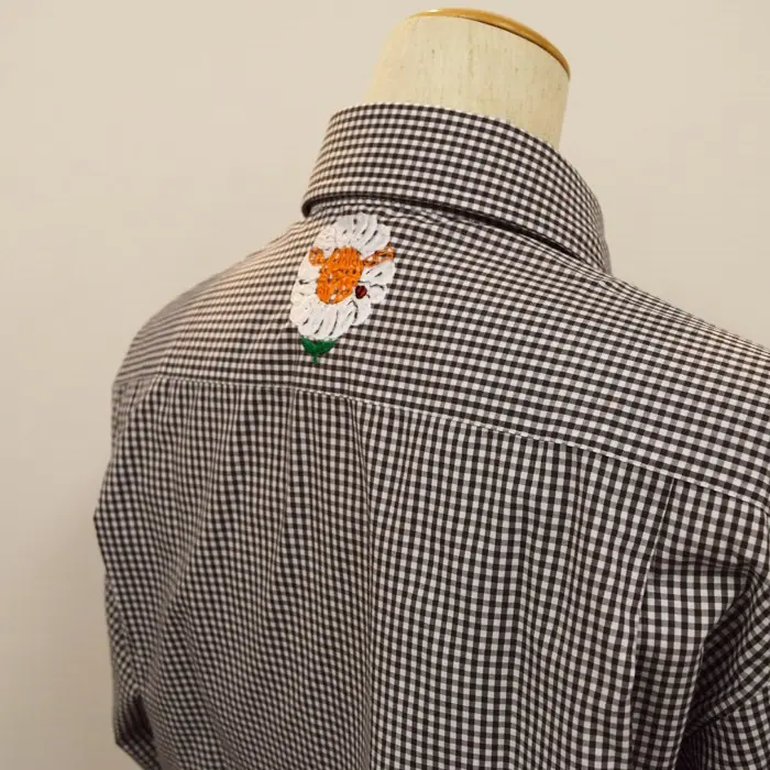 個性的なロゴを、ブラウンのチェックシャツの首下にバシッと刺繍しました。胸付エプロンをつけるので、見えるようにと背中の首下にしました。いい感じです!