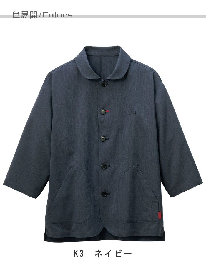 丸衿で柔らかさをプラスした、フレンチカジュアルな雰囲気のコックコート。