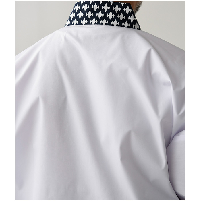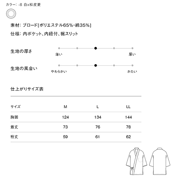 伝統的な柄の松皮菱柄をあしらった縁起の良いハッピーコートカッターシャツでよく使われるブロード生地で作られています。そのため、適度な光沢感があり上品な印象です内側を紐で結び、外側でも紐を結んで着用する仕様。左胸内側にポケットあり、脇の裾にスリットありますので動き易いです。サイズはM~LLの3展開です。※生地違いで同柄の紺があります。