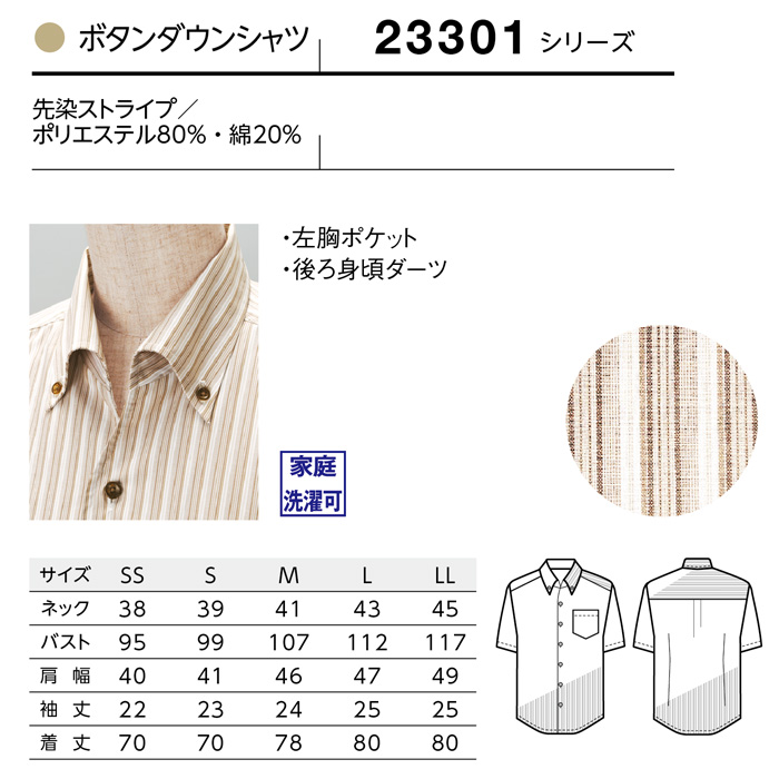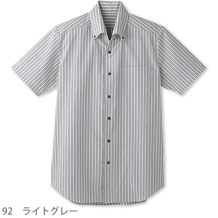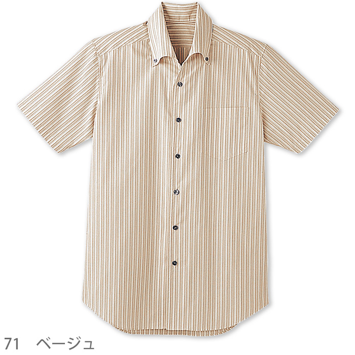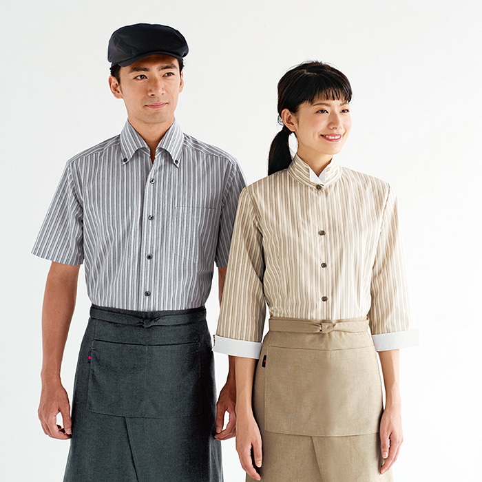 飲食店販売店制服 ストライプ柄ボタンダウンシャツ 半袖【兼用】首元スッキリ