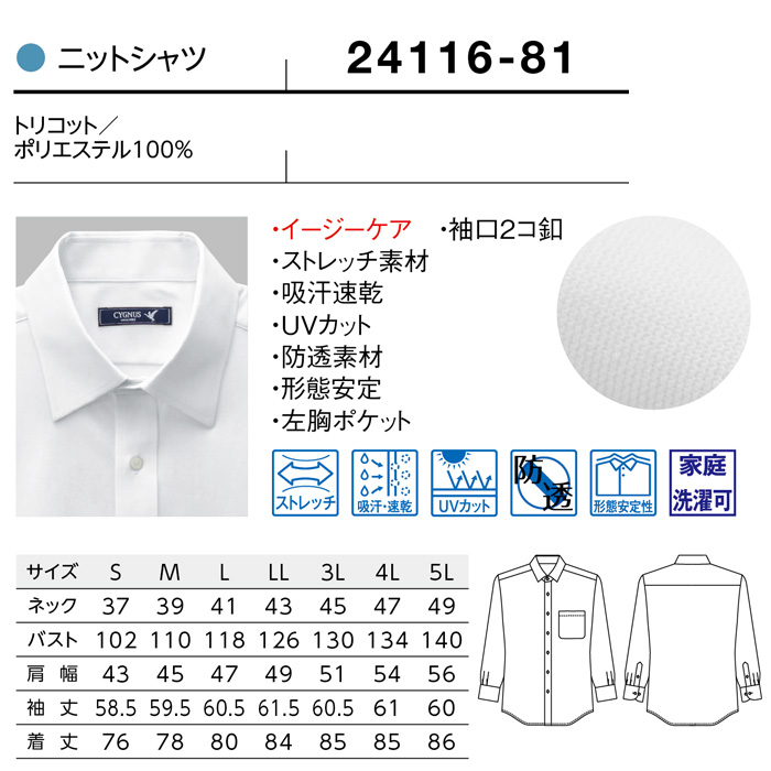 ストレッチ性やノーアイロン、吸汗速乾性など多機能付きながらもお得な低価格を実現したロープライスのメンズニットシャツ(長袖)。左胸ポケット付き。耐久性も高くランニングコストを削減できます。