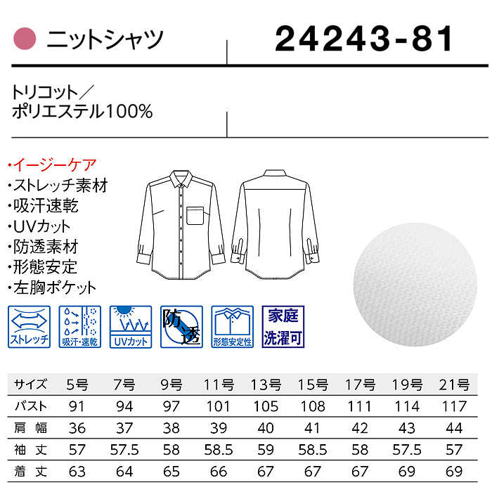 ストレッチ性やノーアイロン、吸汗速乾性など多機能付きながらもお得な低価格を実現したロープライスのレディースニットシャツ(長袖)。左胸ポケット付き。5号~21号までとサイズも豊富。耐久性も高くランニングコストを削減できます。