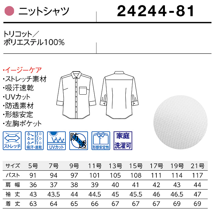 ストレッチ性やノーアイロン、吸汗速乾性など多機能付きながらもお得な低価格を実現したロープライスのレディースニットシャツ(七分袖)。左胸ポケット付き。5号~21号までとサイズも豊富。耐久性も高くランニングコストを削減できます。