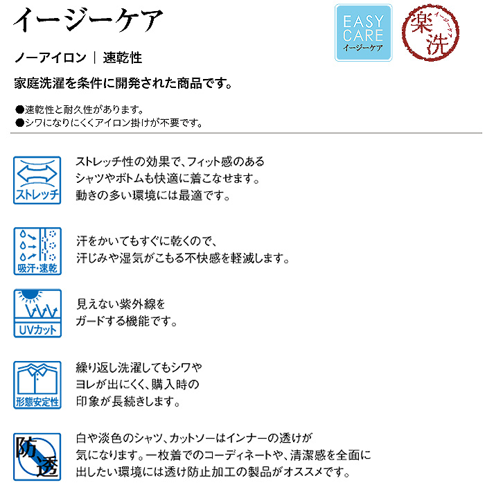 ニット素材でストレッチがあり、肌触りがなめらか。ノーアイロンでOKで形態安定もありイージーケアで洗濯も楽です。