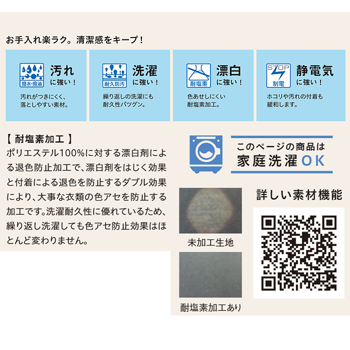 『汚れ』『洗濯』.『漂白』『静電気』に強く、耐塩素加工で色アセ防止効果もあります。薄手で適度なハリがあり、光沢があり上品な印象。