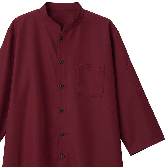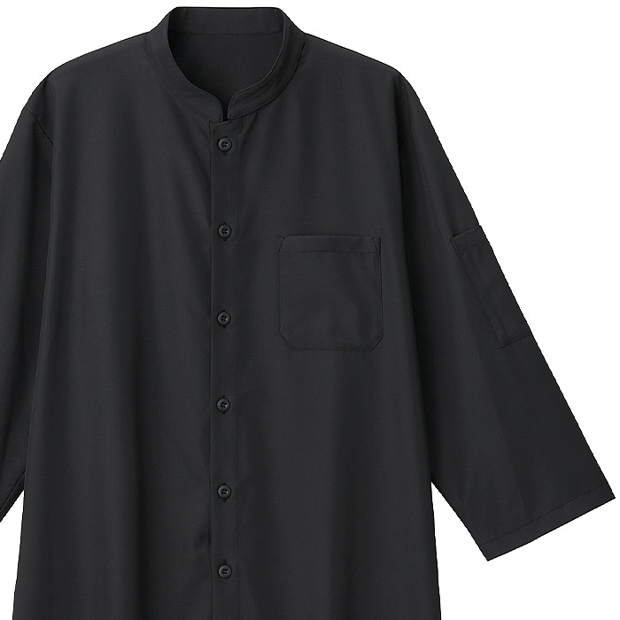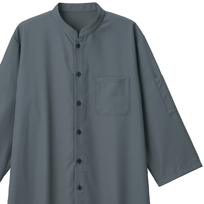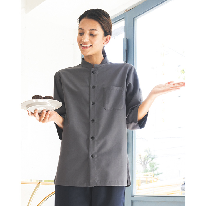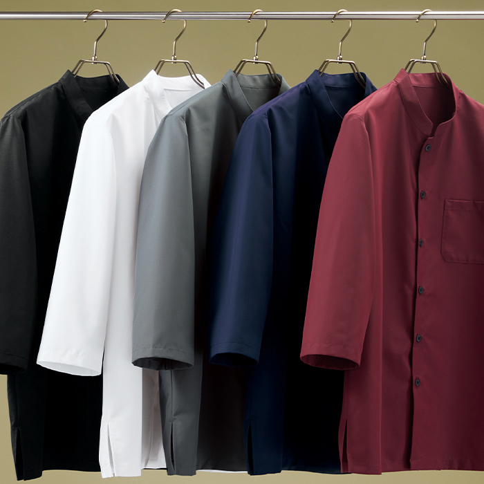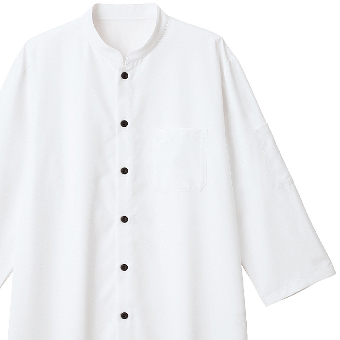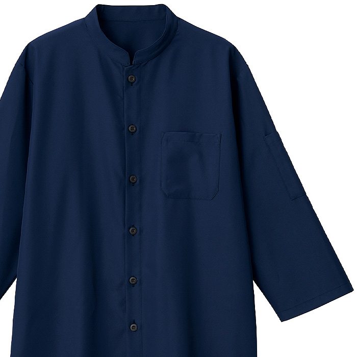無駄のない美しさのベーシックなスタンドカラーショップコート。男女兼用で、ホールでもキッチンでも着用できるシンプルな1着。ポリエステル100%シワになりにくい生地。吸汗速乾で軽量、制電と機能性抜群。七分袖なので洗い物など水仕事でも腕まくりせずにスマートにこなせます。左袖にはさっと取り出しやすいペン差しポケット付き。5色展開です。