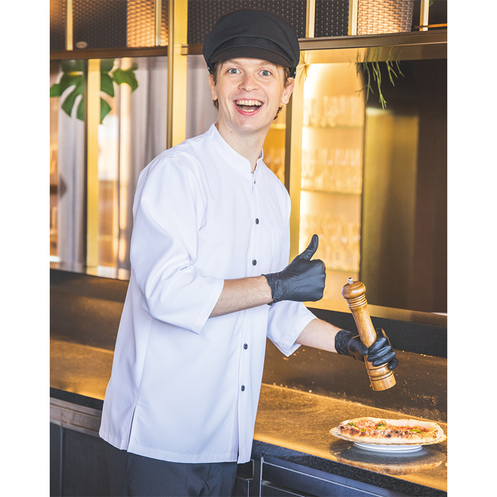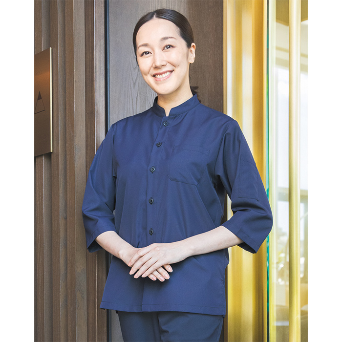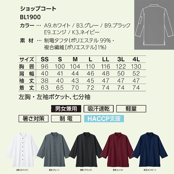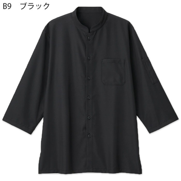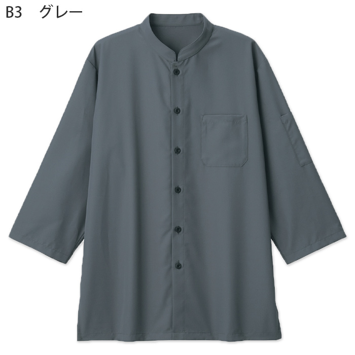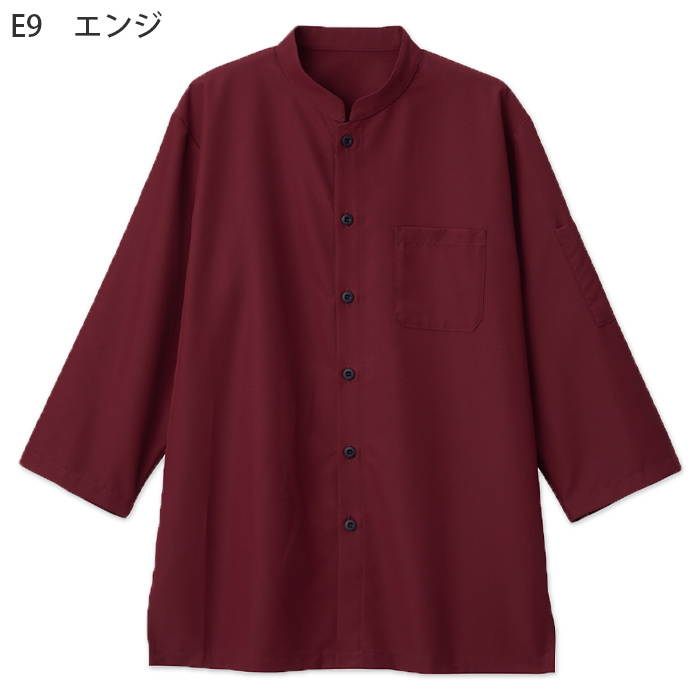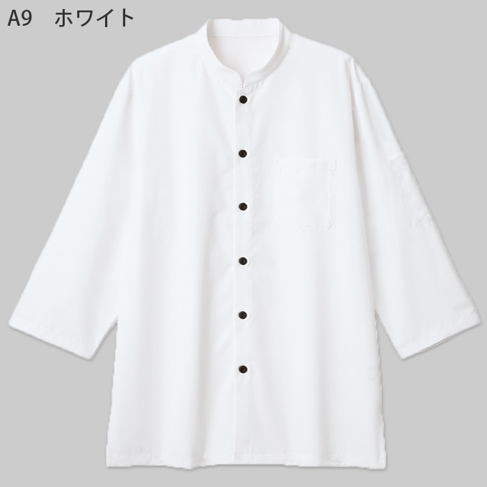 無駄のない美しさのベーシックなスタンドカラーショップコート。男女兼用で、ホールでもキッチンでも着用できるシンプルな1着。ポリエステル100%シワになりにくい生地。吸汗速乾で軽量、制電と機能性抜群。七分袖なので洗い物など水仕事でも腕まくりせずにスマートにこなせます。左袖にはさっと取り出しやすいペン差しポケット付き。5色展開です。