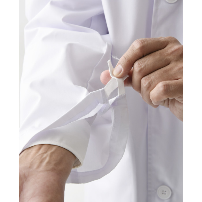 専門性の高いお仕事用白衣コート。袖口には紐が入っていますので、絞ることができ、手を使う作業がしやすくなります。左胸ポケット、腰には左右ポケットあり。後ろにはベント開きあり、脚さばき良い。抗菌防臭機能のある比較的薄い生地で作られたコートです。