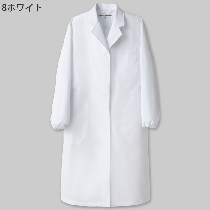 ¥7,700専門性の高いお仕事用白衣コート。見た目スッキリ、ボタンが作業の邪魔をしないボタンが隠れるシングル白衣。