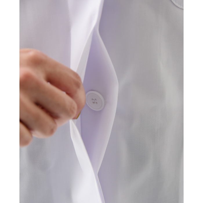 専門性の高いお仕事用白衣コート。見た目スッキリ、ボタンが作業の邪魔をしないボタンが隠れる比翼シングル白衣。袖口には紐が入っていますので、絞ることができ、手を使う作業がしやすくなります。左胸ポケット、腰には左右ポケットあり。後ろにはベント開きあり、脚さばき良い。抗菌防臭機能のある比較的薄い生地で作られたコートです。
