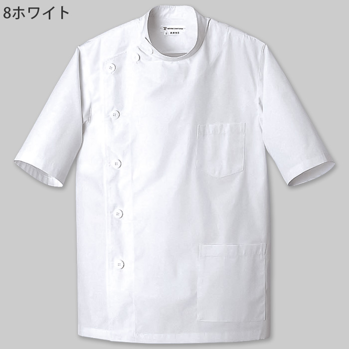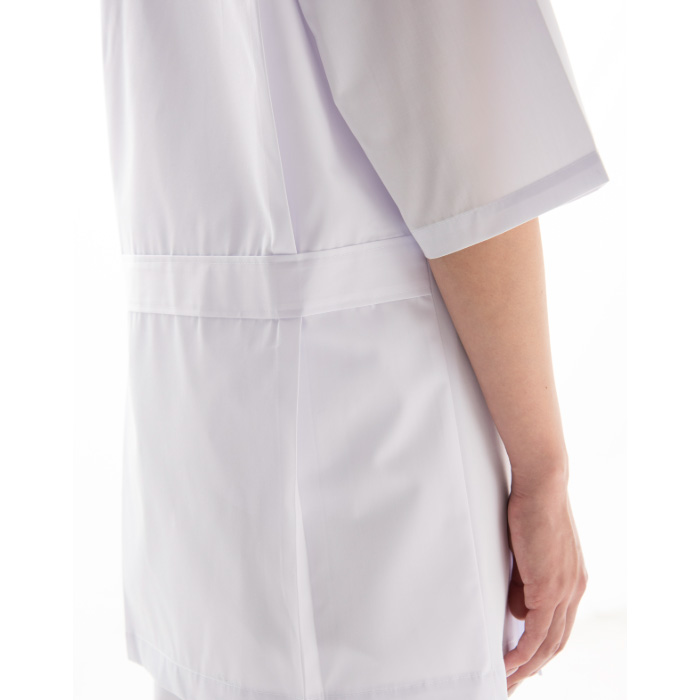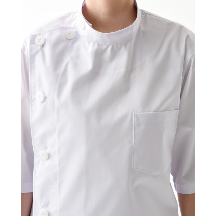 男女兼用5分袖白衣コート。抗菌防臭加工あり。左胸と左腰にポケットあり。
