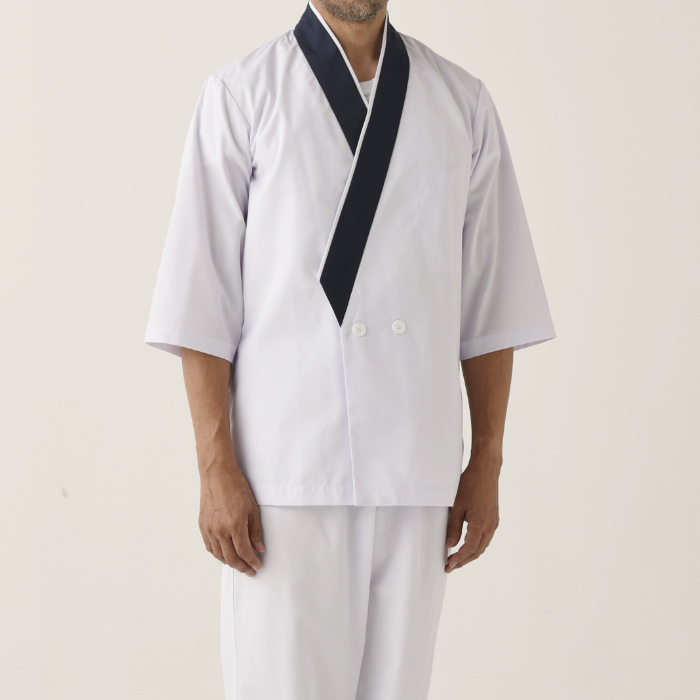 【飲食店販売店ユニフォーム】ボタン留ハッピコート白に紺エリ【男性用】ポリ65%綿35%タッサー