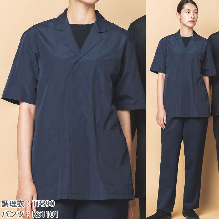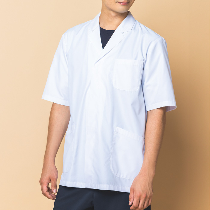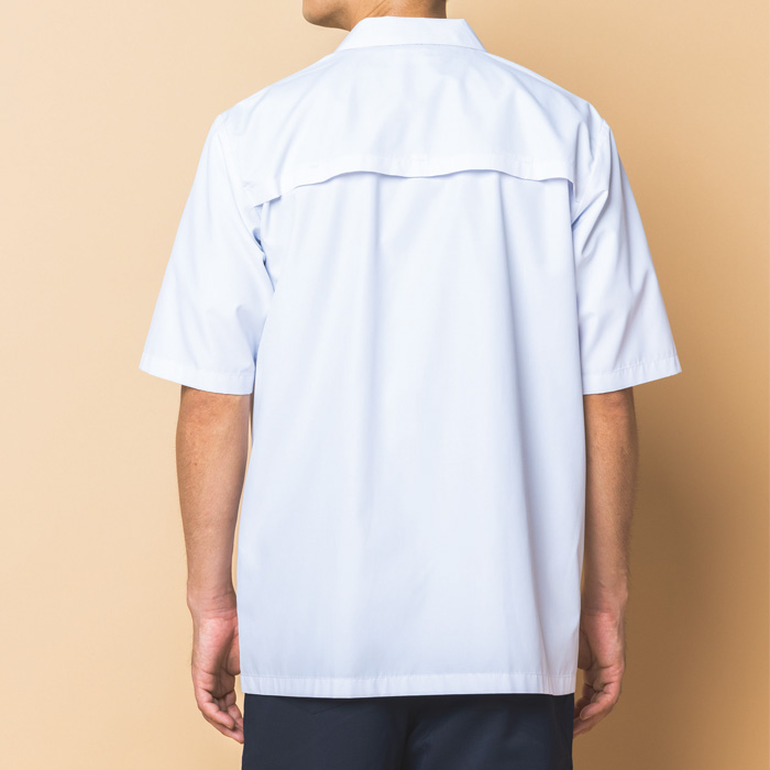機能性と着心地に特化した五分袖(半袖)衿付き調理衣。