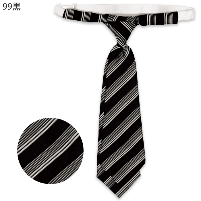 シックで洗練された印象を演出する、女性用ブラックベースのストライプショートネクタイ。結ばず簡単着用。
